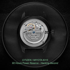 This black dial black PVD automatic racing watch - powered by the Japan made automatic movement Citizen/Miyota 8315 with a 60-hour power reserve (approx.) - is equipped with a choice of a two-piece black vegetable tanned Italian rally leather strap, a black "Rally" Tropic rubber strap, or a 316L stainless steel beads-of-rice bracelet.