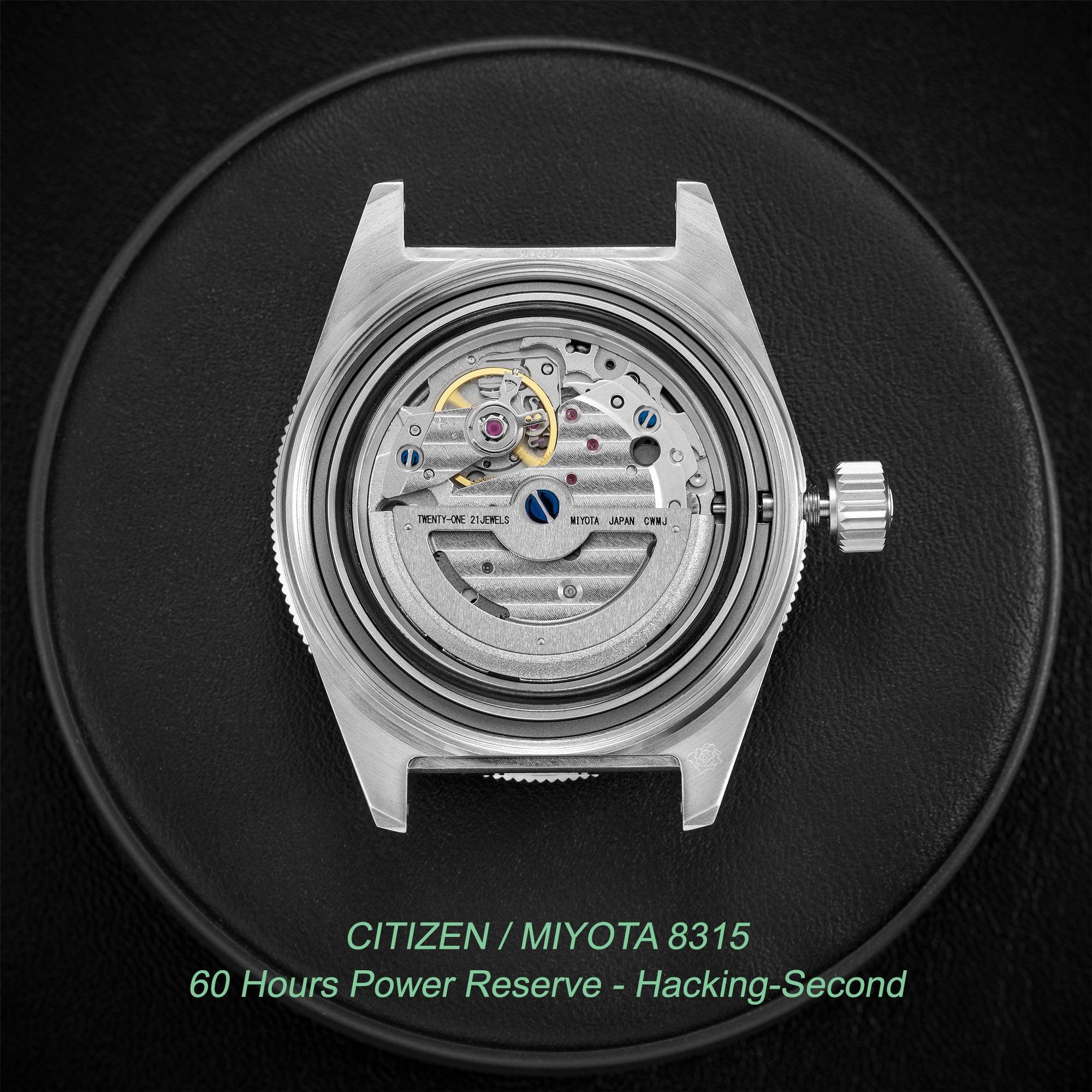 This automatic Skindiver watch, powered by the Japanese Citizen/Miyota 8315 automatic movement with a 60-hour power reserve (approx.), comes equipped with a choice of a black tropic rubber strap or a 316L stainless steel beads-of-rice bracelet.