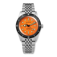 This 38 mm Skindiver Automatic "Reduxed" watch features an orange dial with indices in C3 Super-LumiNova®, the Wolbrook iconic arrow hour hand, a glass box sapphire crystal, a 316L stainless steel case — water-resistant to 200 m with a screw-down crown.