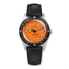 This orange 38 mm automatic Skindiver watch, powered by Japanese Citizen/Miyota 9039 automatic movement with a 42-hour power reserve (approx.), is equipped with a choice of an orange Tropic rubber strap, a black Tropic rubber strap, or a 316L stainless steel beads-of-rice bracelet.