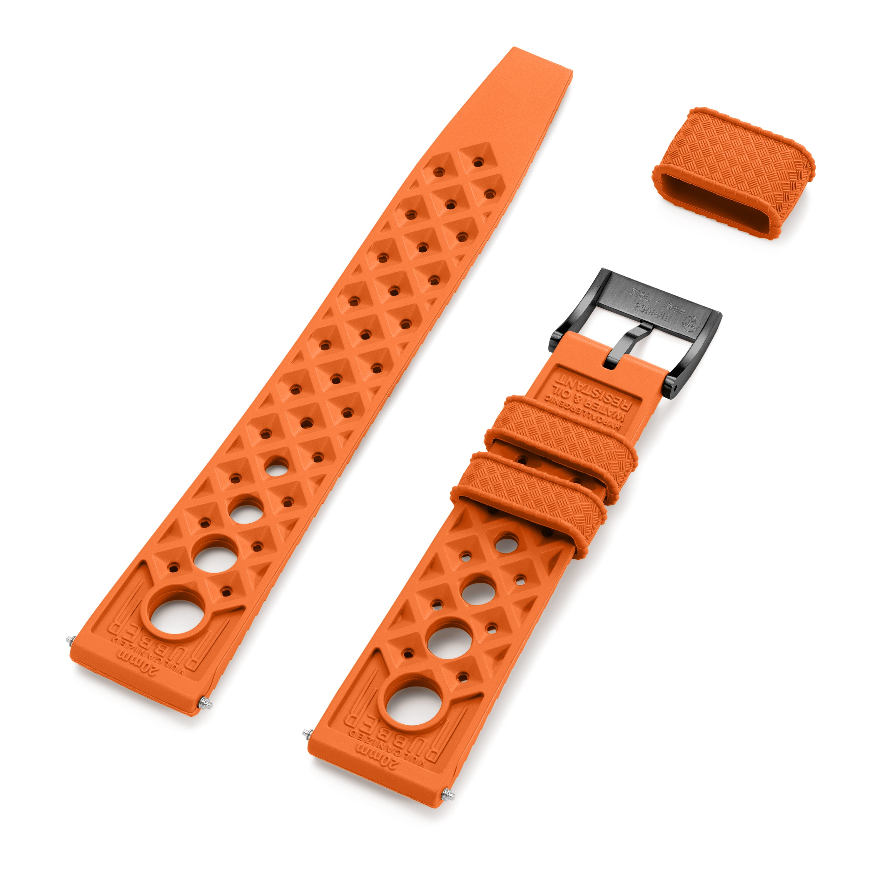 Wolbrook orange Tropic straps are made of NBR vulcanized rubber and features 2mm diameter spring-bars. This is a 20mm rubber band.