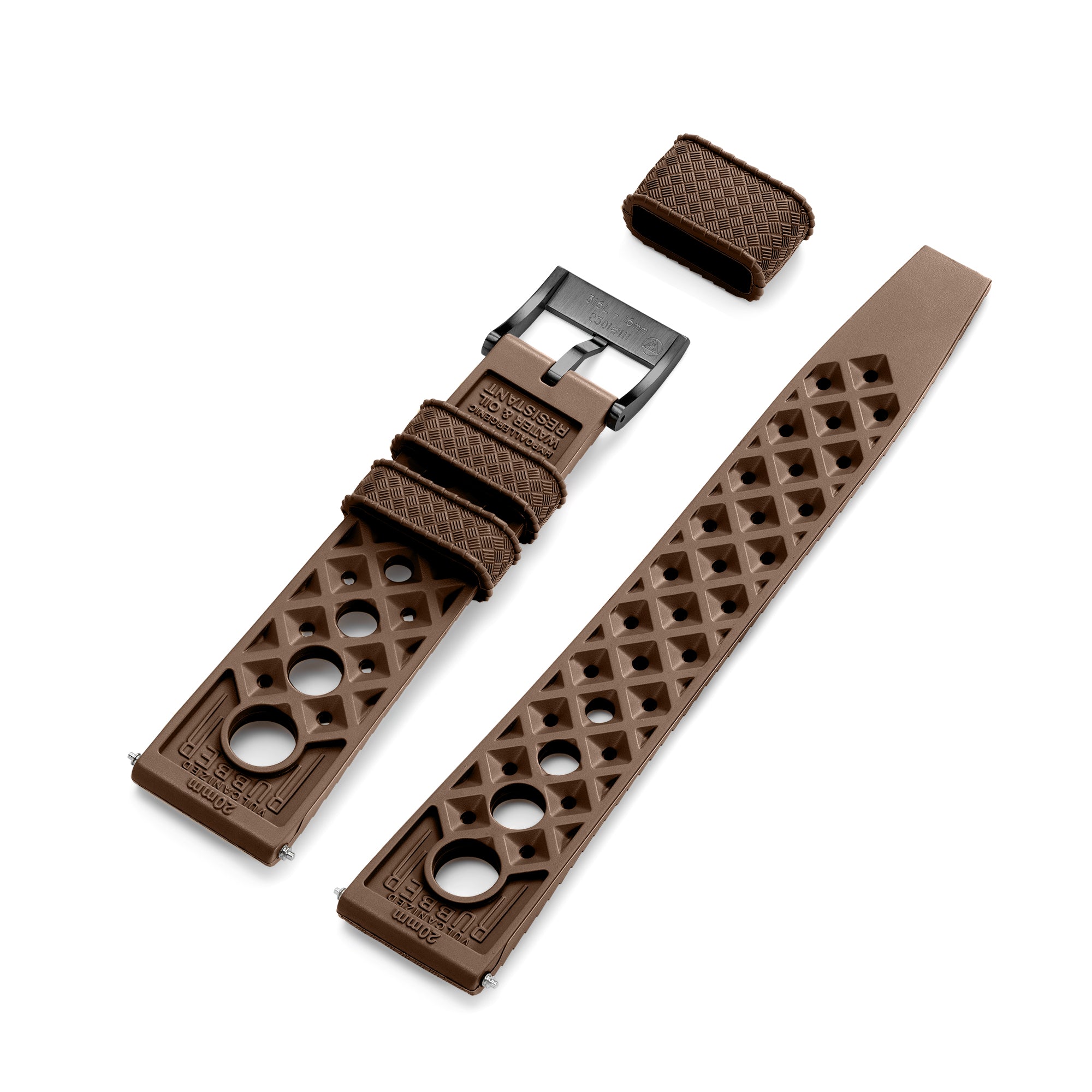Wolbrook fresh and new take on the classic Tropic rubber watch strap in brown color.
