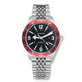 This Skindiver WT Mecaquartz Airexpo 2025 - Special Edition wristwatch features a black dial with BGW9 Super-LumiNova®, the iconic hour arrow hand, a sapphire glass, a steel case and bezel with a blue, green or red aluminum insert - water resistant to 150m.